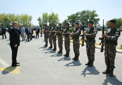 | Une photo fournie par le service de presse de la présidence turque montrant le président Recep Tayyip Erdogan (gauche) et des membres des forces spéciales de police, le 29 juillet 2016 à Ankara. |