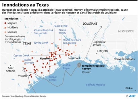 Selon les autorités, environ 30% du comté de Harris, qui inclut Houston, serait inondé. De 30.000 à 40.000 habitations seraient endommagées, selon un bilan provisoire.