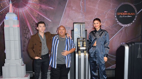 | Les acteurs Tom Holland, Jacob Batalon et Zendaya, membres du casting de "Spider-Man: Far From Home" lors d'un événement à à New York, le 24 juin. |