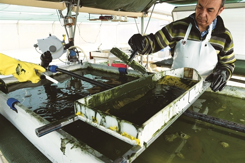 | Un travailleur récolte des algues bleu-vert «spiruline» dans le village de Condillac au Sud-Est de la France. |
