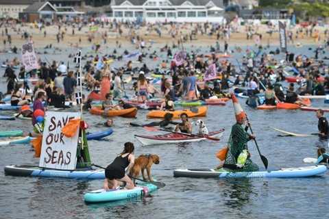 | Des écologistes manifestent sur des planches de surf, paddles et kayaks à Falmouth (Cornouailles) en marge du sommet du G7 le 12 juin 2021. |
