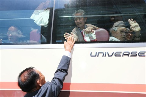 | La Sud-Coréenne Lee Keum-seom (dans le bus) dit au revoir à son fils vivant au Nord, Ri Sang Chol, au Mont Kumgang, le 22 août. |