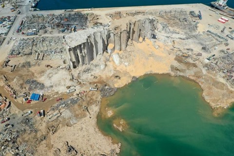 Ce stock de nitrate, saisi à bord d'un navire et entreposé sur le port depuis des années, avait pris feu, provoquant la gigantesque déflagration. Le bloc de silos, une imposante structure de 48 mètres de haut, avait une capacité de plus de 100.000 tonnes. Le ministre libanais de l'Économie, Raoul Nehme, a déclaré en novembre qu'il devrait être détruit, mais les autorités n'ont pas encore pris de décision à ce sujet.