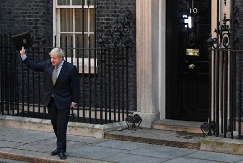 | Le Premier ministre britannique Boris Johnson salue la foule devant le 10 Downing Street le 13 décembre au lendemain de sa victoire aux législatives. |