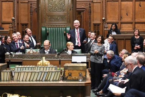 | Photo publiée par le Parlement britannique montrant le nouveau speaker (président) élu le 4 novembre dernier, Lindsay Hoyle (centre), s'adressant à la Chambre des communes le même jour. |