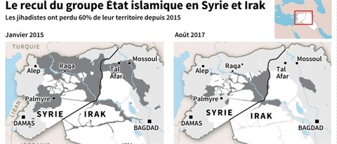 | Comparaison des zones contrôlées par le groupe jihadiste État islamique en janvier 2015 et août 2017 en Syrie et en Irak. |