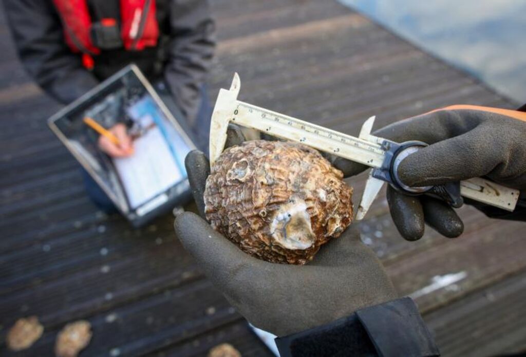 | David Smyth, responsable de la Conservation marine chez Ulster Wildlife, mesure la taille d'une huître dans le port de Belfast, le 28 novembre. |