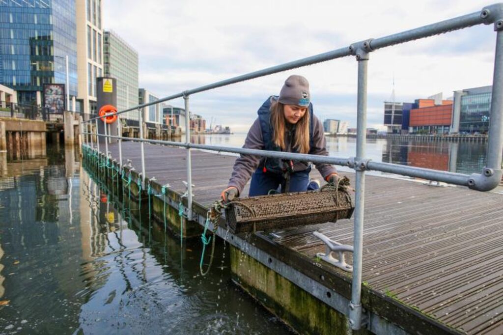 | Rachel Millar, de l'organisation Ulster Wildlife, tient une cage à huîtres, le 28 novembre, dans le port de Belfast, où ces mollusques sont réintroduits. |