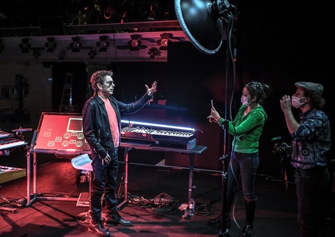 | Le musicien Jean-Michel Jarre (gauche) s'adresse à sa femme, l'actrice chinoise Gong Li (2e à droite) sur la scène, avant le concert virtuel à Notre-Dame de Paris, le 31 décembre 2020. |