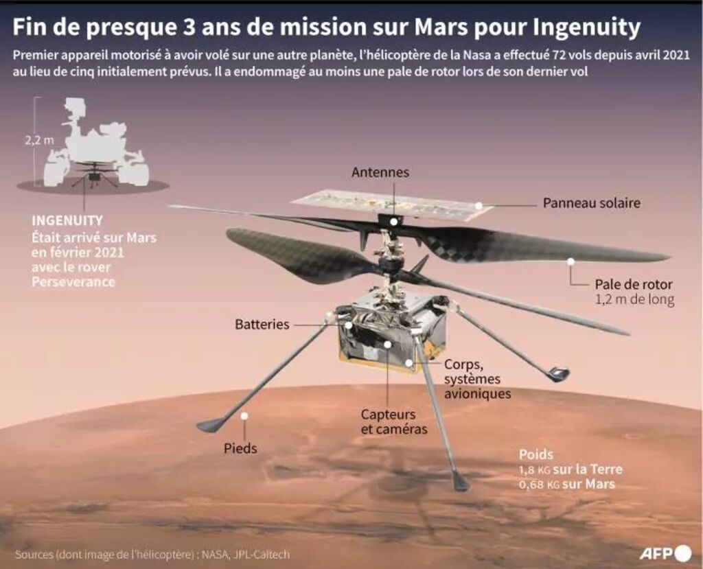 Au total, il a parcouru quelque 17 km et volé jusqu'à une altitude de 24 m. Son temps de vol cumulé s'élève à plus de deux heures. Il était arrivé sur Mars en février 2021, avec le rover Perseverance, dont la mission est de chercher des traces de vie microbienne ancienne sur Mars.