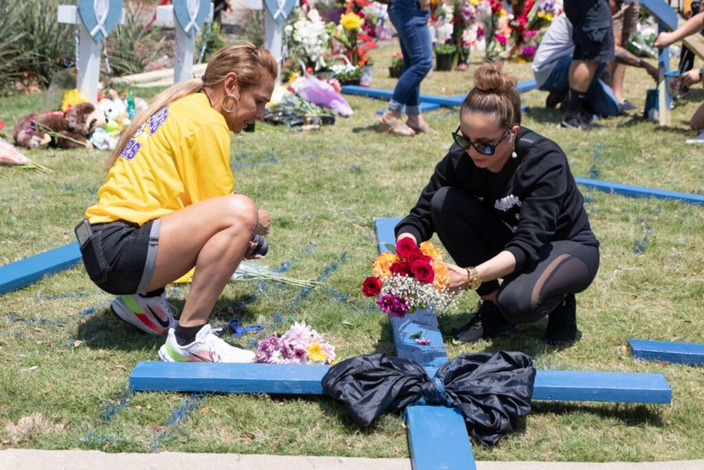 | Une femme dépose des fleurs sur une grande croix en hommage aux victimes d'une fusillade de masse devant un centre commercial à Allen, dans le Texas, aux États-Unis, le 8 mai 2023. |