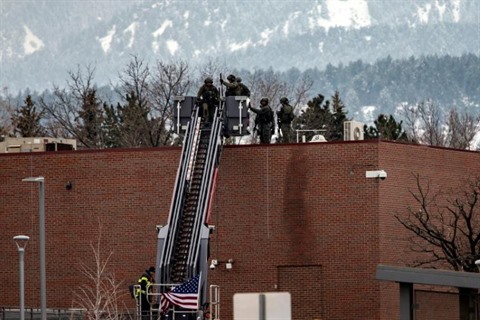 | Des policiers interviennent sur le toit d'un supermarché où a eu lieu une fusillade à Boulder, dans le Colorado, le 22 mars. |
