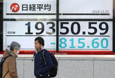 Des piétons passent devant un tableau d'indices boursniers, le 25 décembre à Tokyo, au Japon. Photo: AFP/VNA/CVN |
