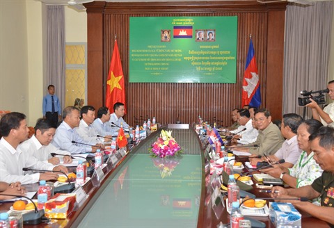 | La séance de travaile le 14 septembre entre le vice-ministre vietnamien des Affaires étrangères, Vu Hông Nam, et le gouverneur de Kampong Chhnang, Chhua Channdoeun, à Kampong Chhnang, au Cambodge. |