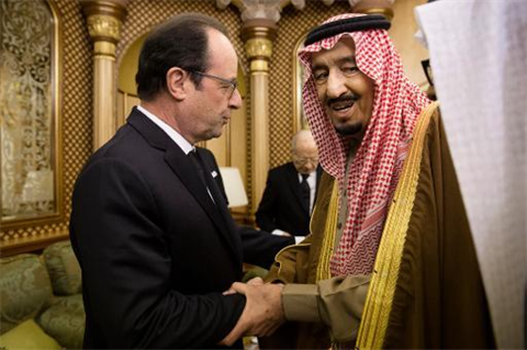| Le président français François Hollande (gauche) présente ses condoléances au nouveau roi d'Arabie saoudite Salmane, le 24 janvier 2015 à Ryad. |
