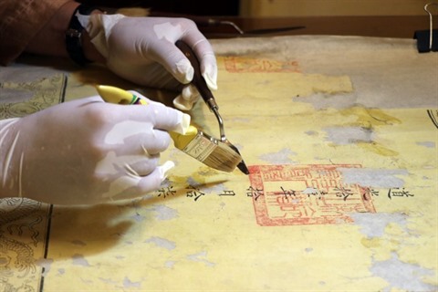 | Restauration d'un ancien document sous la dynastie des Nguyên. |