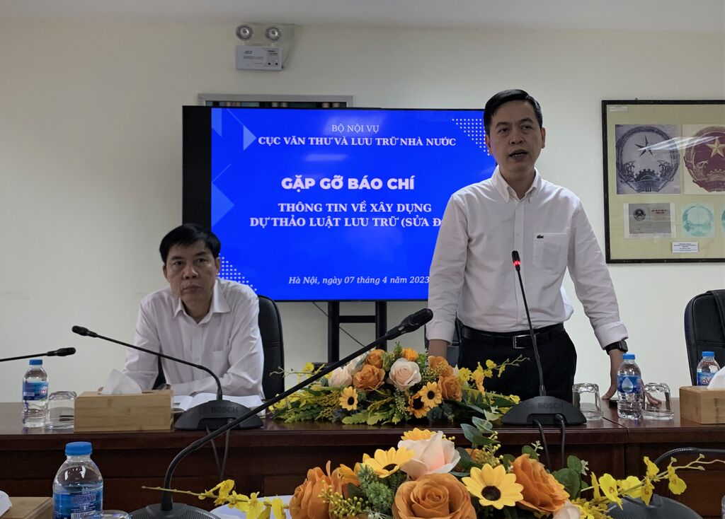 | Dang Thanh Tùng, chef de la Direction d’État des archives du Vietnam, prend la parole lors d’une conférence presse tenue à Hanoï. |