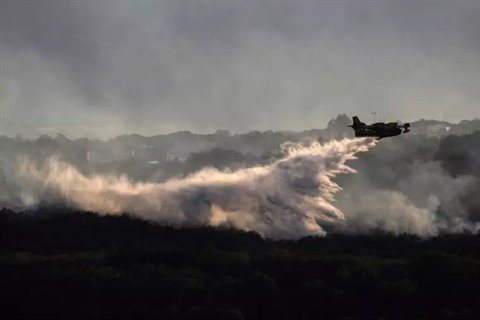 | Un Canadair intervient pour éteindre les incendies près du village de Vogüé en Ardèche le 27 juillet. |