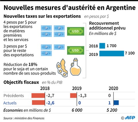 Elles ont annoncé de nouvelles taxes sur les exportations et le président argentin Mauricio Macri a présenté lundi un plan ambitieux de coupes pour réduire le déficit budgétaire du pays à zéro en 2019. Il était de 3,9% en 2017.