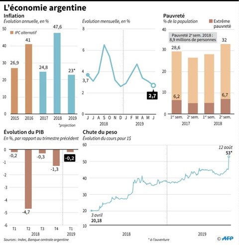 "Ce n'est qu'un avant-goût de ce qui va arriver (...) Beaucoup de gens ne vont pas laisser leur argent dans ce pays, et vont s'en aller. C'est terrible ce qui peut arriver", a prévenu lundi soir 12 août le chef de l'État lors d'une conférence de presse, appelant à ne pas "revenir au passé". Pour l'heure, le chef de l'État n'a annoncé aucune mesure, se limitant à indiquer que son équipe était au travail. Submergée par deux crises monétaires en 2018 ayant fait perdre 50% de sa valeur à sa monnaie, l'Argentine a appelé le FMI à la rescousse pour obtenir un prêt de plus de 57 milliards de dollars en échange d'une cure d'austérité budgétaire. Les premiers remboursements sont prévus en 2021.