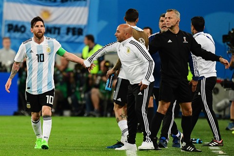 | Le joueur vedette de l'équipe argentine de football Lionel Messi (gauche) et son sélectionneur Jorge Sampaoli, le 30 juin à Kazan. |