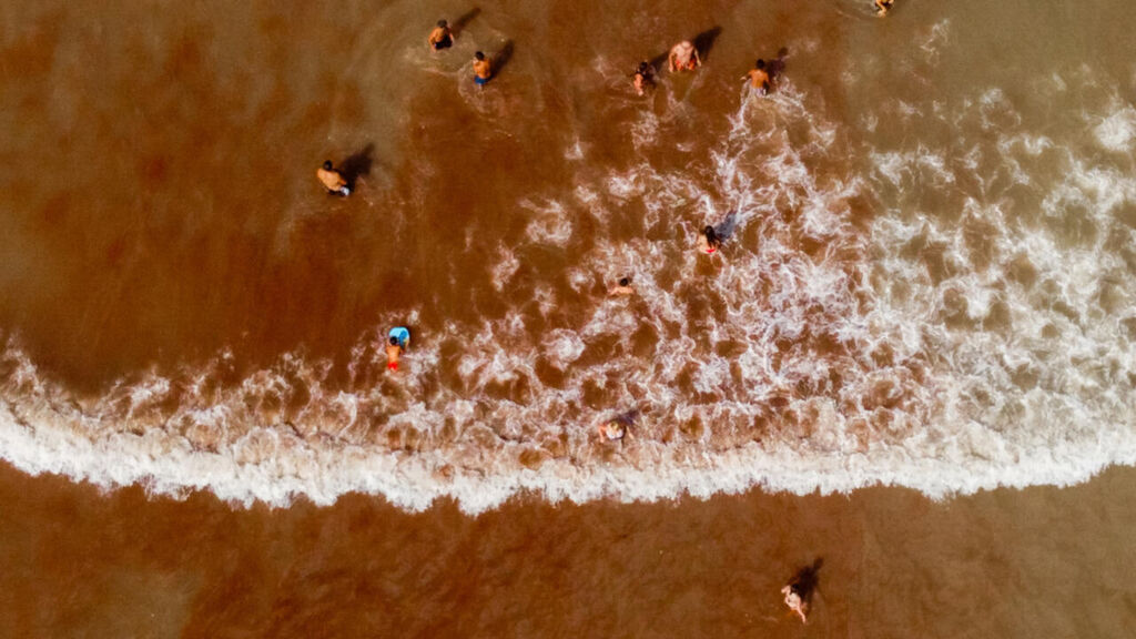 | Des personnes se baignant dans une mer exceptionnellement rouge à Mar del Plata, dans la province de Buenos Aires, en Argentine, le 21 février. |