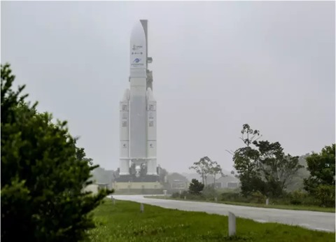 | La fusée Ariane 5, qui emporte le télescope spatial James Webb (JWST), arrive sur son pas de tir, le 23 décembre au Centre spatial de Kourou, en Guyane. |