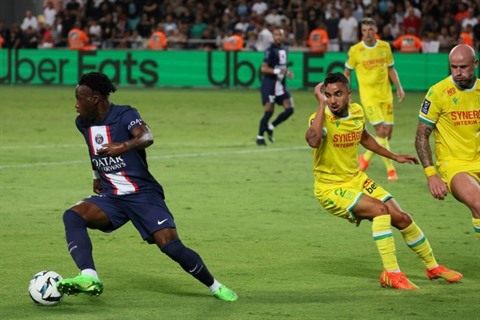 | L'attaquant du Paris-SG, Arnaud Kalimuendo, balle aux pieds lors du trophée des Champions contre le FC Nantes dans le Bloomfield Stadium de Tel Aviv en Israël le 31 juillet. |