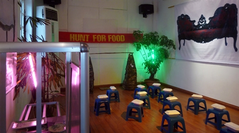 Samedi 19 mai, Arno Baude inaugurait la deuxième installation de son exposition à la 4uatrieme. «Banh my hawaii tasting». Le visiteur était alors invité à s’asseoir sur des tabourets en plastique comme on en trouve dans toutes les rues de Hanoi. En fond, un message «Hunt for food». L’artiste souligne ainsi une spécificité locale «Être obligé de chasser pour se nourrir, +struggle for survive+, c’est propre à pas mal de gens qui vivent en ASEAN». Il met en avant la convivialité, le «système D» de ces restaurants de rue. En décalage, on trouve, dans un coin, un fauteuil «rococo», aspiration à la richesse. Et dans le fond, une palanque qui ne porte pas son titre de «guerre économique».