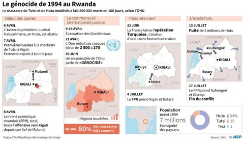 | Carte et chronologie, avec chiffres clés, du génocide de 1994 au Rwanda. |