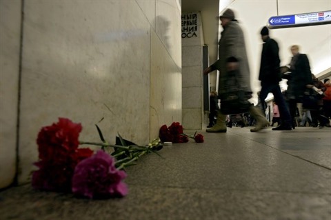 | Des fleurs déposées en hommage aux victimes de l'attentat du métro de Saint-Pétersbourg, le 4 avril dans la station de l'Institut Technologique. |