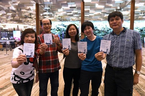 | Des passagers du vol SQ22, le plus long vol commercial au monde, un marathon de près de 19 heures entre Singapour et New York, le 11 octobre à Singapour |
