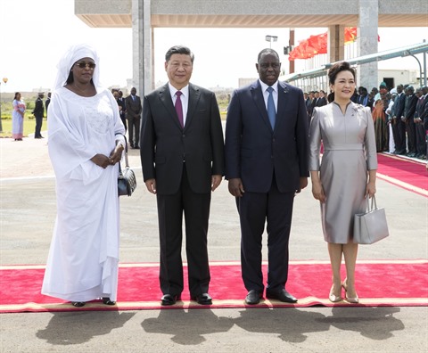 | Le président Xi Jinping (2e à gauche) et son épouse Peng Liyuan (1er à droite) ont été accueillis le 21 juillet par son homologue sénégalais Macky Sall et son épouse, à Dakar, Sénégal. |