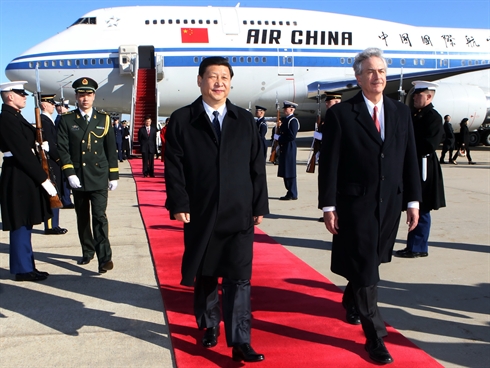 | Le vice-président chinois Xi Jinping (gauche) est accueilli par le sous-secrétaire d’État américain William Burns, le 13 février à l’aéroport international de Washington. |