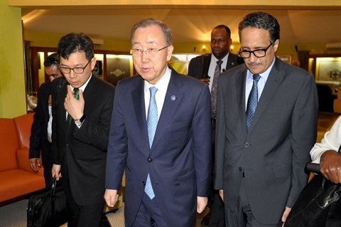| Le secrétaire général de l'ONU, Ban Ki-moon (centre), le 3 mars à Nouakchott. |