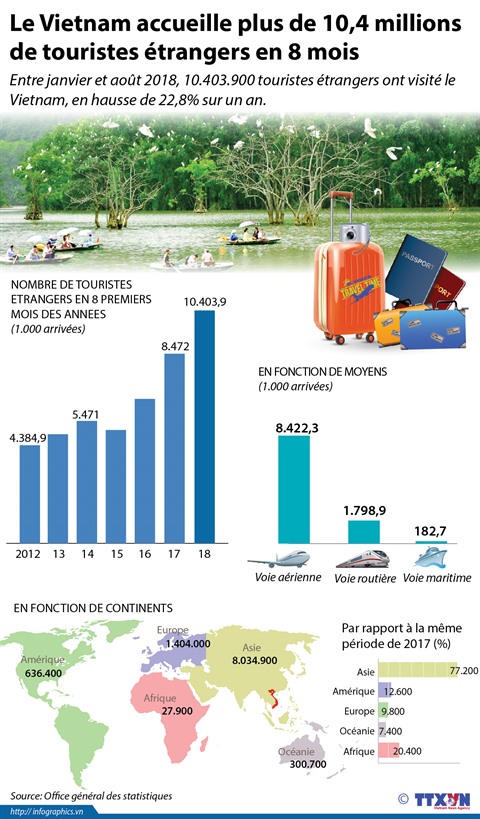 Entre janvier et août 2018, 10.403.900 touristes étrangers ont visité le Vietnam, en hausse de 22,8% sur un an.