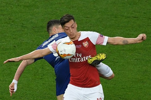| Le milieu d'Arsenal, Mesut Ozil (devant), à la lutte avec celui de Chelsea Jorginho, en finale de la C3, le 29 mai à Bakou. |