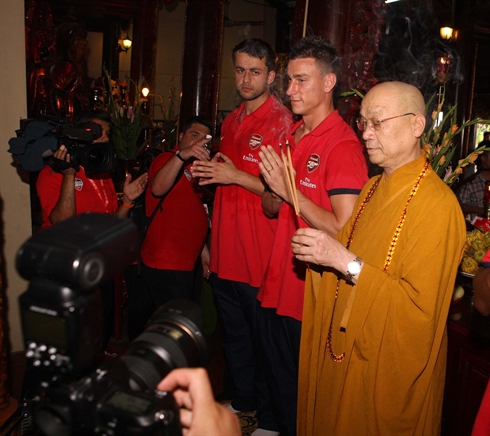 | Les joueurs d’Arsenal à la pagode Trân Quôc le 16 juillet. |