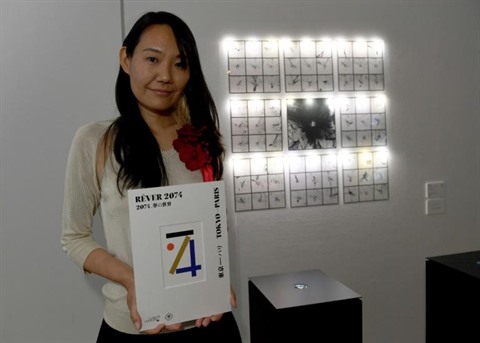 | Aya Kawato devant son œuvre inspirée de nouvelles de science-fiction à Tokyo, le 16 juin. |