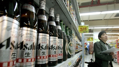 | Des bouteilles de bière de la marque Asahi dans un supermarché de Shanghai (Chine). |