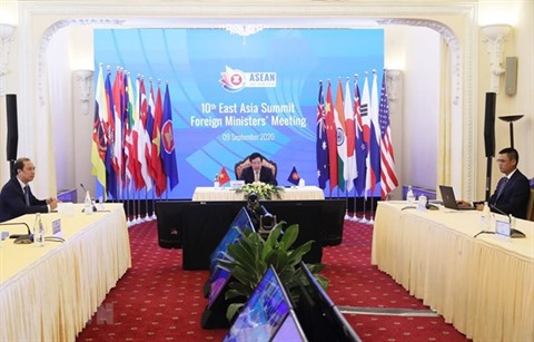 | Le vice-Premier ministre et ministre vietnamien des Affaires étrangères, Pham Binh Minh (centre), préside, le 9 septembre, le 10e Sommet des ministres des Affaires étrangères de l'Asie de l'Est. |