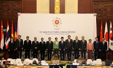 | Les participants de la 19e conférence consultative des ministres de l’Économie de l’ASEAN+3, le 4 août à Vientiane, au Laos. |