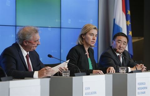 | La chef de la diplomatie européenne Federica Mogherini (centre) et le ministre luxembourgeois des Affaires étrangères Jean Asselborn (gauche), le 7 novembre au Luxembourg |