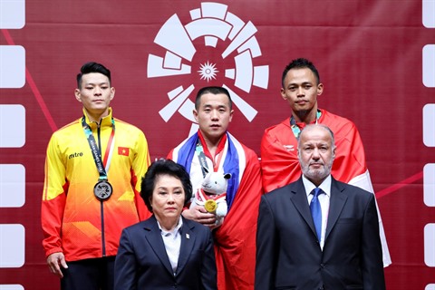 | L’haltérophile Thach Kim Tuân (1er à gauche) décroche une médaille d'argent lors de la deuxième journée de compétition des 18e ASIAD. |