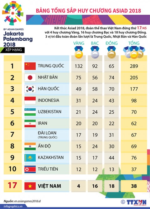 | Le Vietnam se situe au 17e rang du classement par nations des ASIAD 2018. |