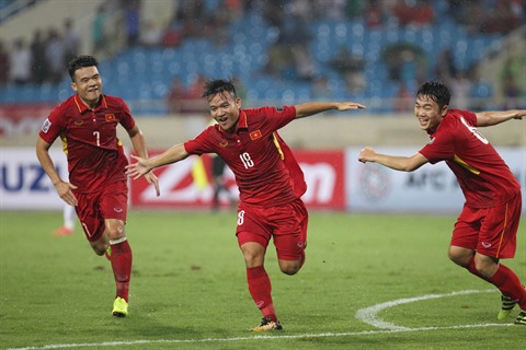 | L'attaquant Dinh Thanh Trung (centre) après avoir marqué le premier but lors du match entre le Vietnam et le Cambodge, le 10 octobre, au stade de My Dinh à Hanoï. |
