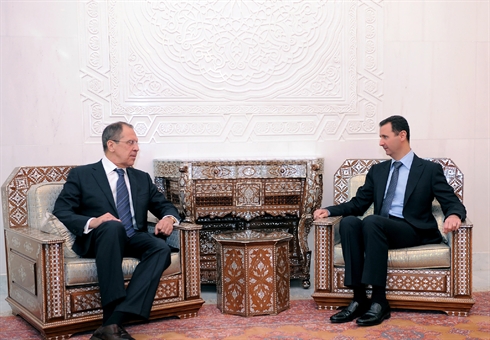 | Le président syrien Bachar al-Assad (droite) et le ministre russe des Affaires étrangères Sergueï Lavrov, le 7 février à Damas. |
