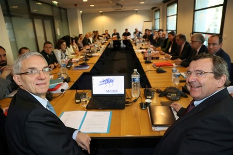 | Alexandre Saubot (gauche) et Michel Guilbaud aux négociations sur l'assurance chômage, le 28 mars à Paris. |