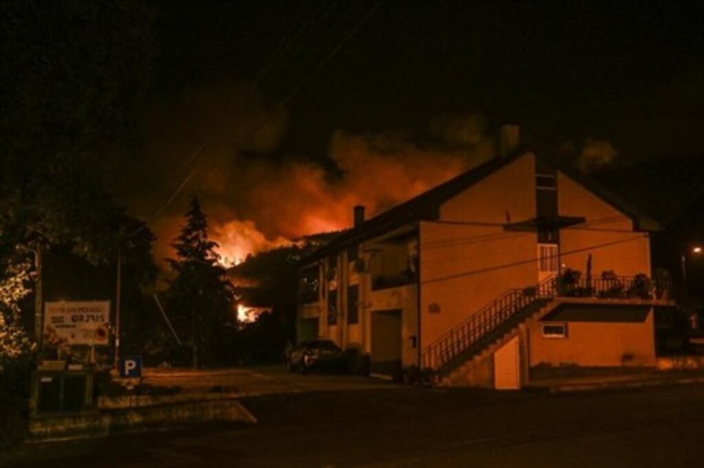 | Un feu de forêt s'approche du village d'Orjais, au pied du parc naturel de la Serra da Estrela, dans le Centre du Portugal, le 17 août 2022. |