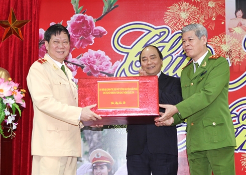 | Le vice-Premier ministre Nguyên Xuân Phuc (centre) offre un cadeau aux représentants du Département de la police routière et ferroviaire à l'occasion du Têt traditionnel. |